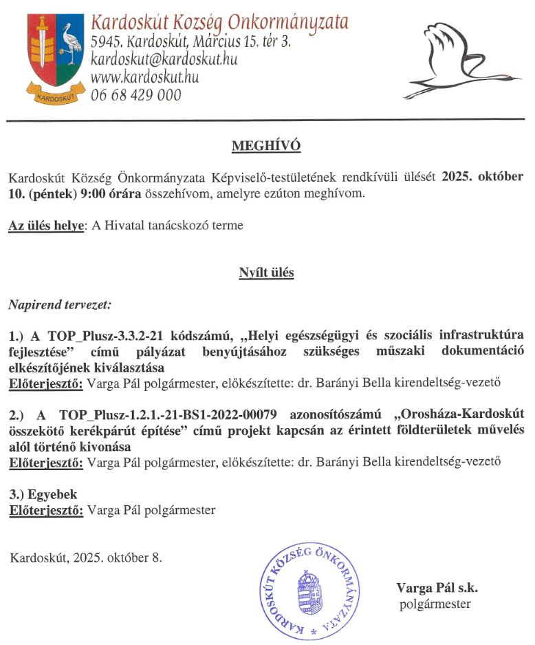 A kérelem benyújtására 2025. október 31. napjáig van lehetőség a Kardoskút Község honlapján letölthető nyomtatványon, amely IDE kattintva érhető el, illetve a Hivatalban kérhető formanyomtatványon.