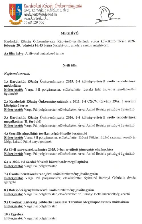 Beküldve: 2026-02-13Meghívó a soros testületi ülésre A napirendi pontokhoz tartozó előterjesztések február 16-tól lesznek megismerhetőek.