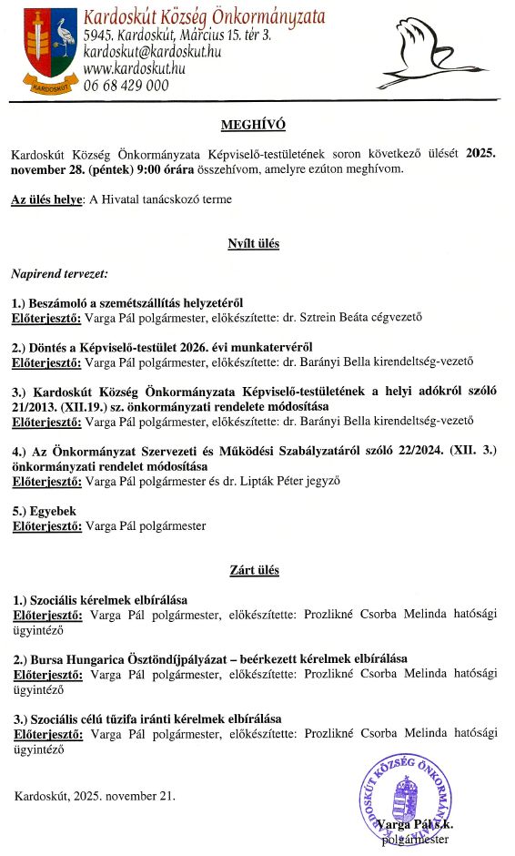Beküldve: 2025-11-21 Szerző: vargapal@kardoskutMeghívó az idei utolsó soros testületi ülésre Az előzetesen kiadott előterjesztések ITT érhetőek el.